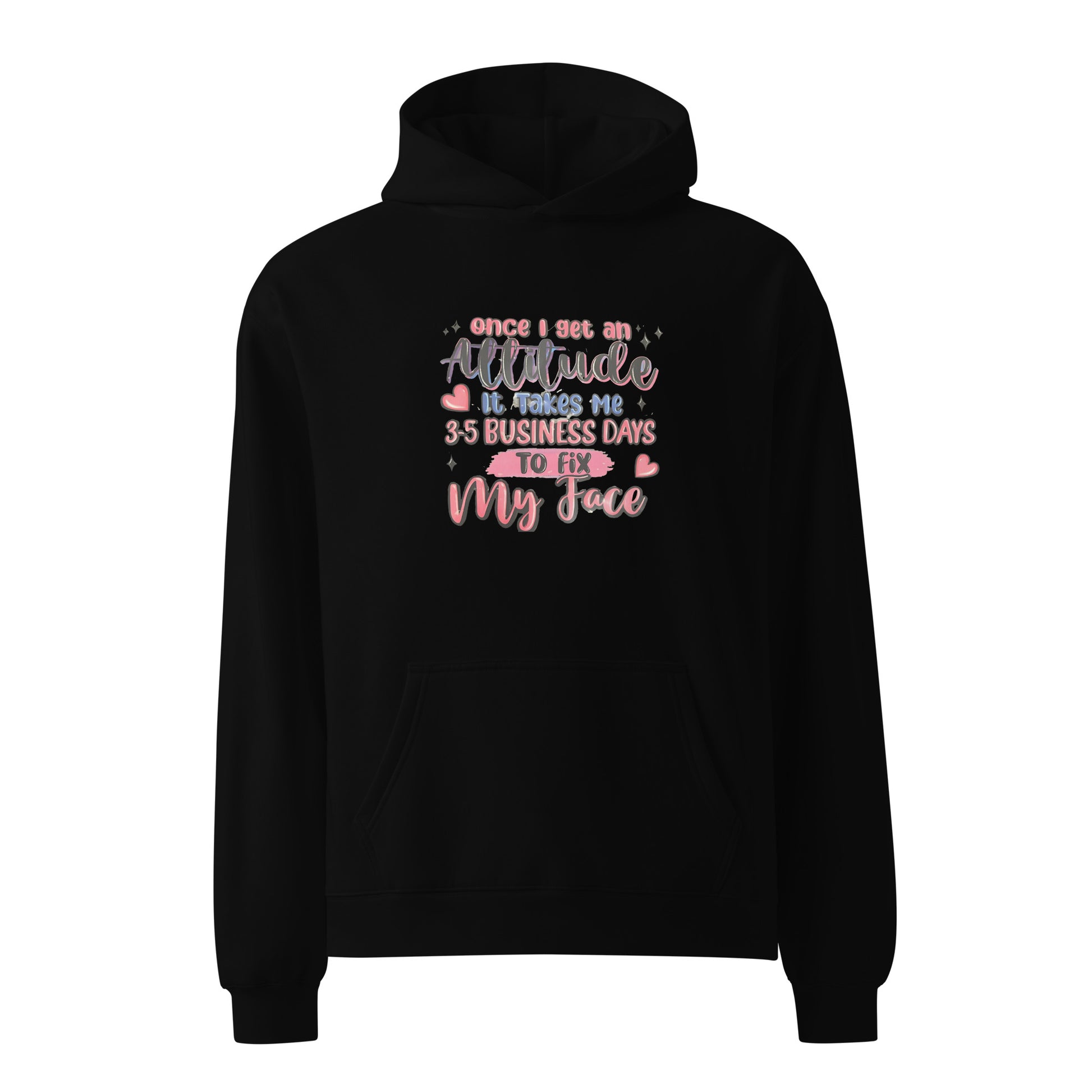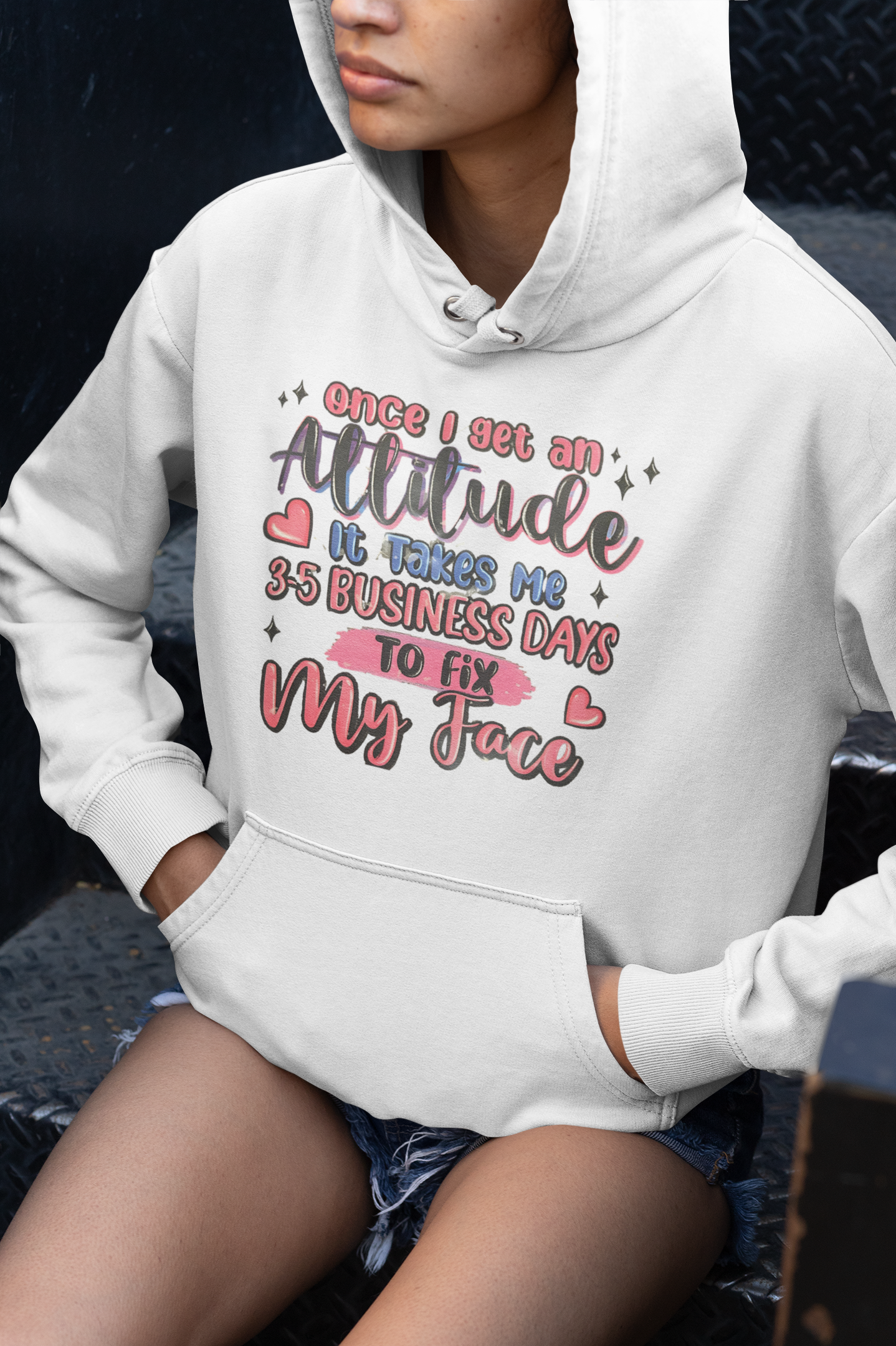 Ready to show some attitude? The "Attitude Adjustment Hoodie" is perfect for those days when you need to let everyone know it might take a little while to fix your face. Featuring the playful yet bold quote, "Once I get an attitude, it takes me 3-5 business days to fix my face," this hoodie combines humor with comfort. Made from premium soft fabric, it's designed for a relaxed fit, making it your go-to piece for chilly days or when you’re feeling a little extra. Whether you’re lounging at home, running errands, or making a statement, this hoodie is sure to turn heads and spark a smile.