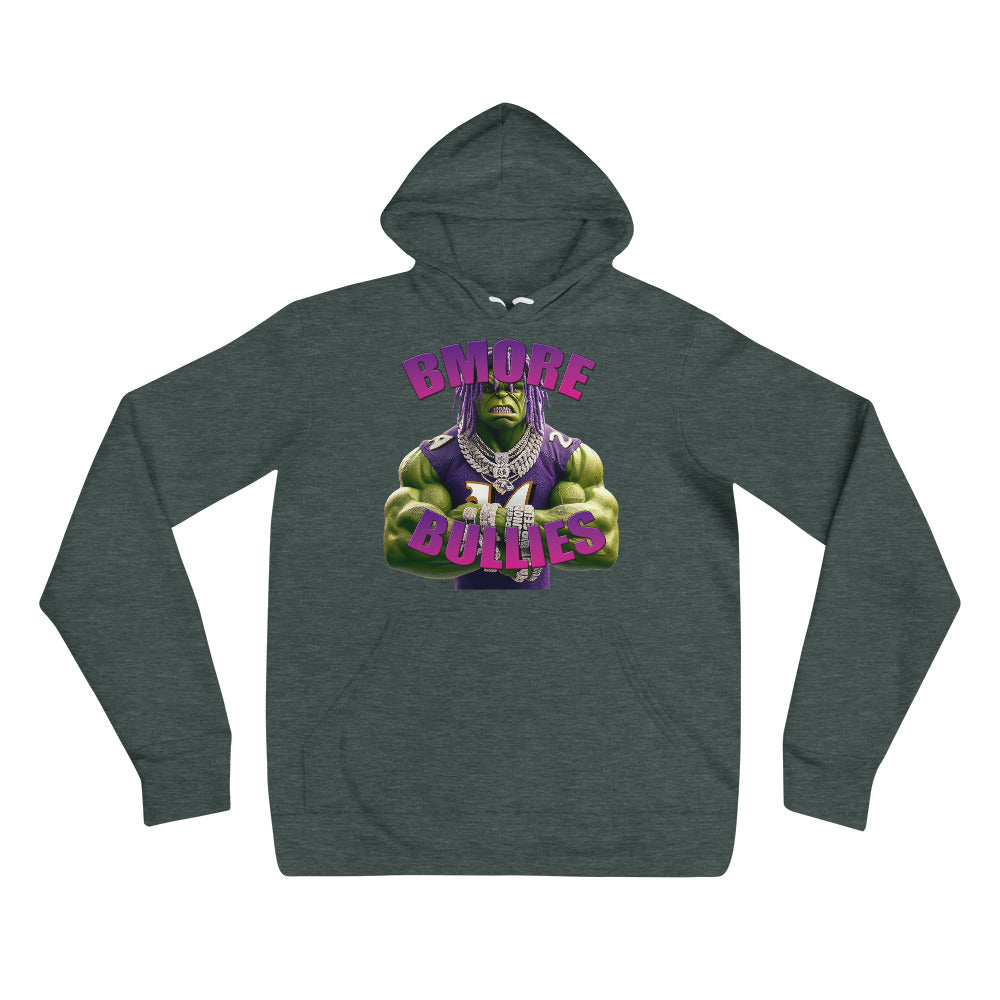 Calling all Baltimore Ravens fans! Show your unwavering support for the flock with our exclusive "Bmore Bullies" hoodie. This bold and dynamic design features a fierce, Hulk-like character sporting Ravens gear, embodying the strength, determination, and spirit of Baltimore's finest.